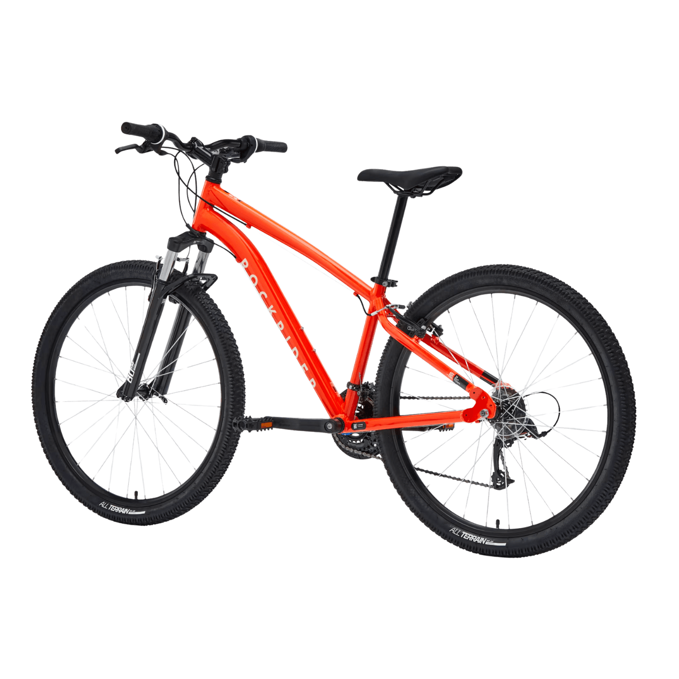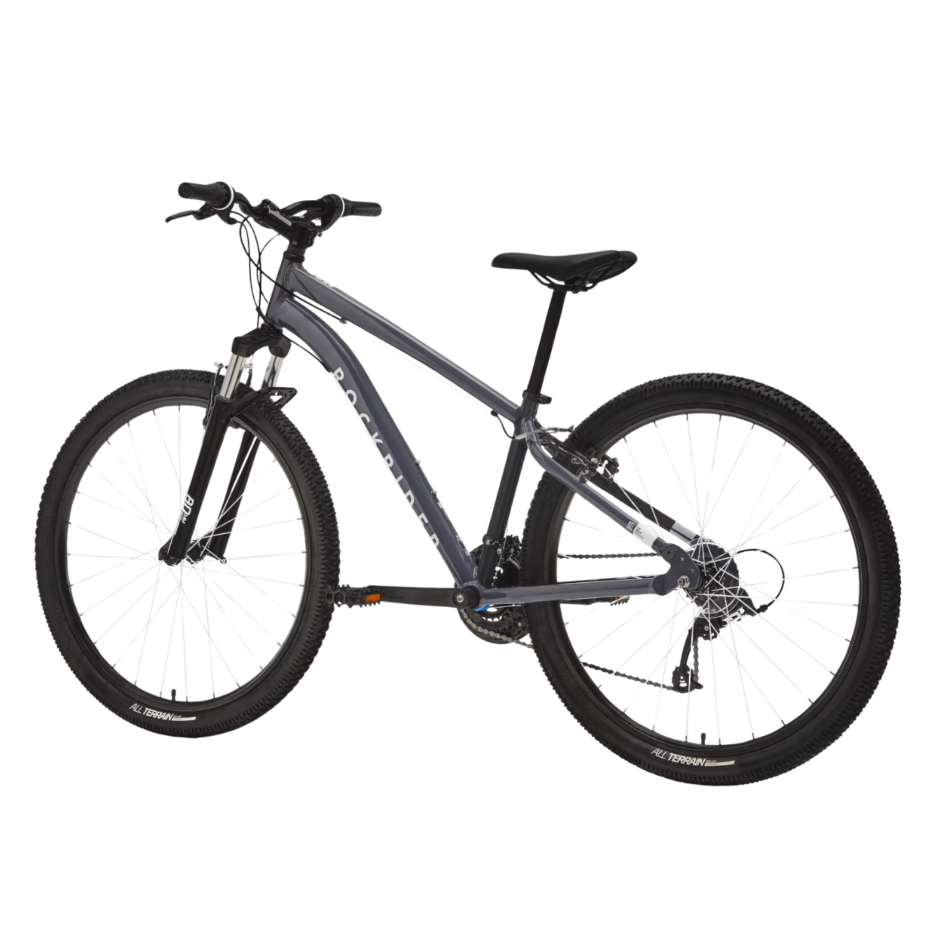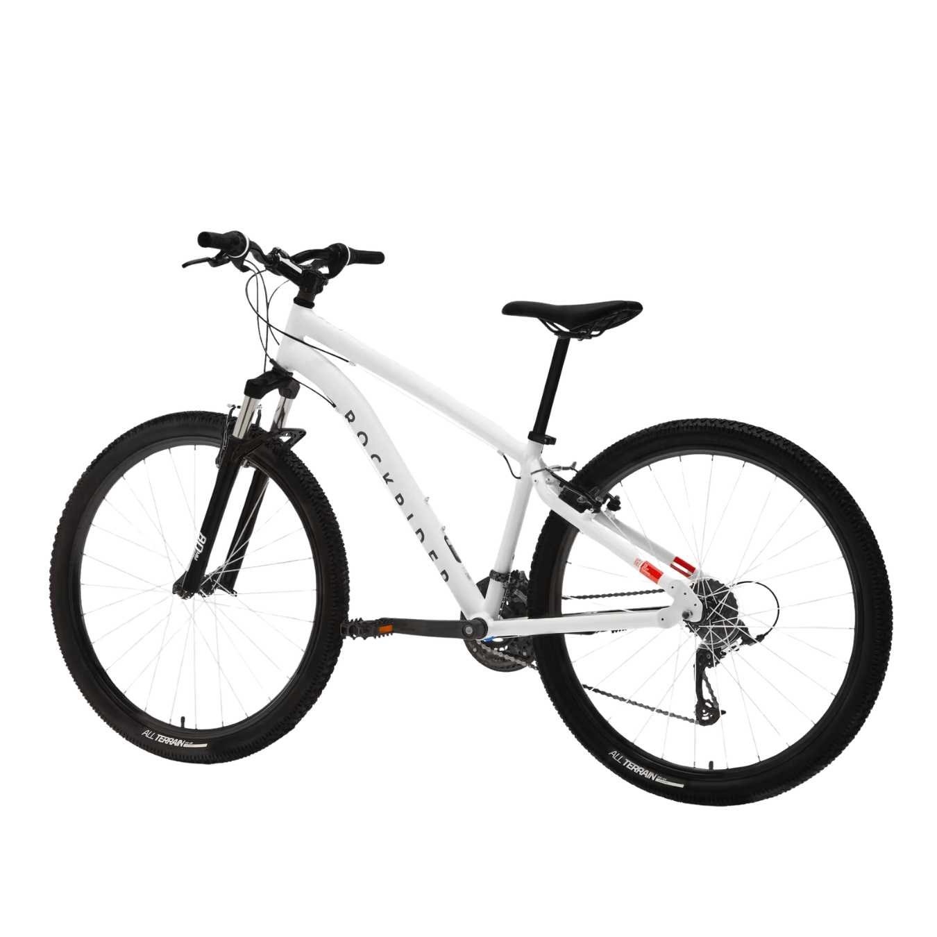 Effectief en robuust, deze fiets van ROCKRIDER met aluminium frame en wielen van 27.5″, gemonteerd op dubbelwandige velgen, is verkrijgbaar in de kleuren zwart, rood en grijs.