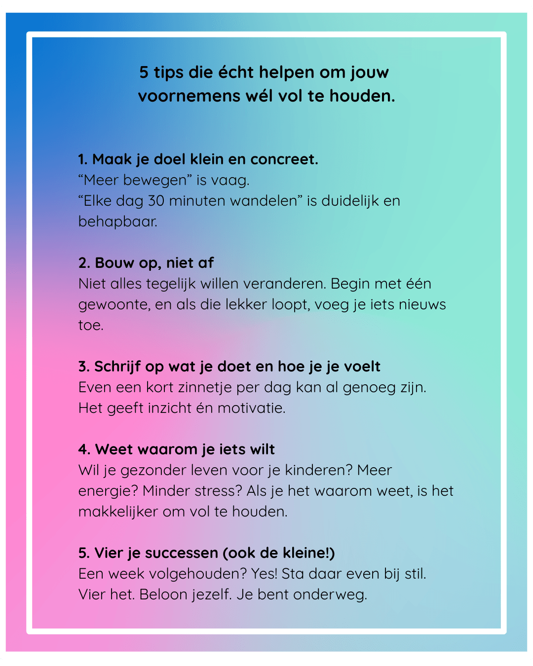 Goede voornemens hoeven geen zelfopgelegde strafkampen te zijn. Integendeel. Door jezelf goed voor te bereiden, slimme keuzes te maken en te kiezen voor doelen die écht bij jou passen, wordt het makkelijker om ze vol te houden. Bovendien hoef je niet perse 1 januari te starten, maar kan het natuurlijk elk moment.